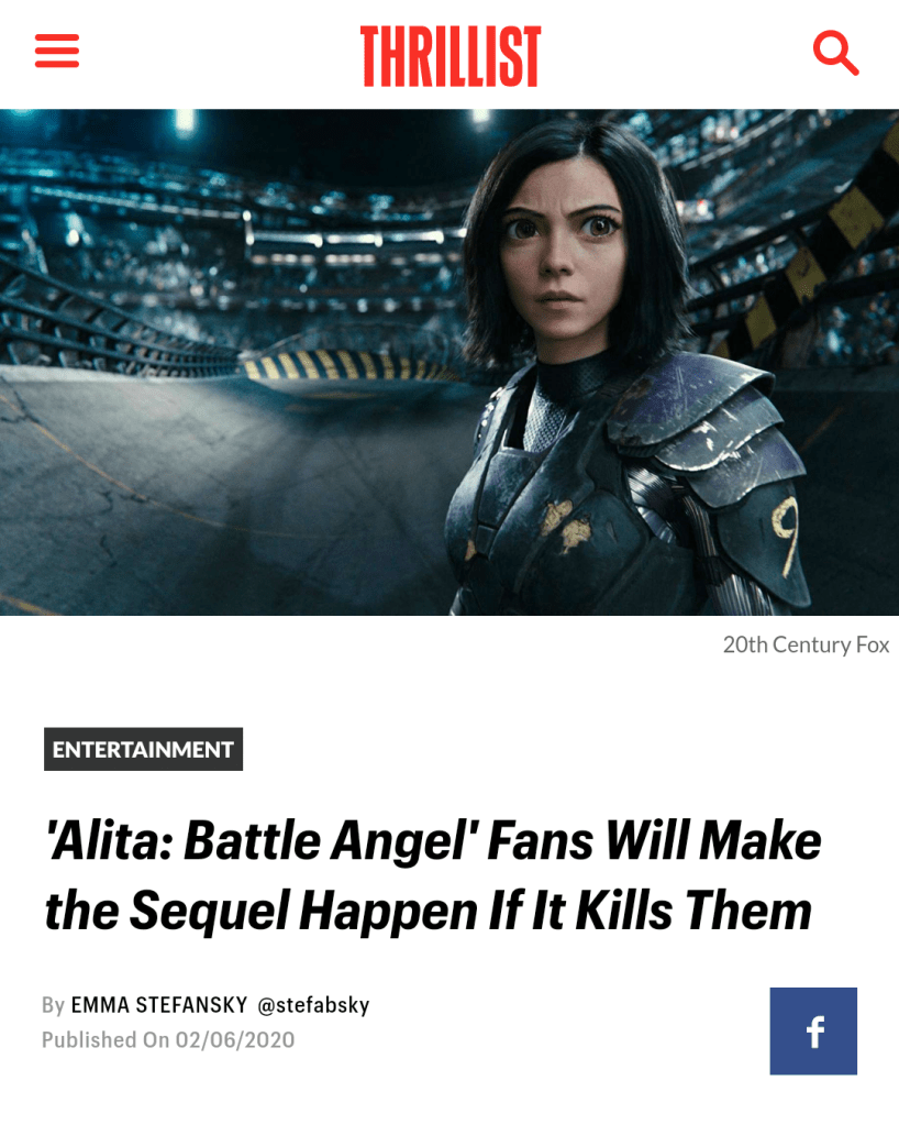 We are a community of Alita: Battle Angel fans who are dedicated to supporting Alita and Rosa Salazar POSITIVELY. If you want to help Alita get a sequel, the best way to do it is to be vocal, be active, and be positive. Being respectful to other fans and fan bases while using the "#AlitaArmy" hashtag will do #AlitaBattleAngel a lot of good. Alita needs us. We are all she's had for support.