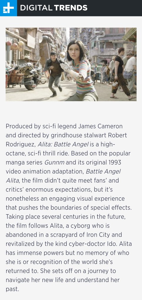 “Produced by sci-fi legend James Cameron and directed by grindhouse stalwart Robert Rodriguez, Alita: Battle Angel is a high-octane, sci-fi thrill ride.”