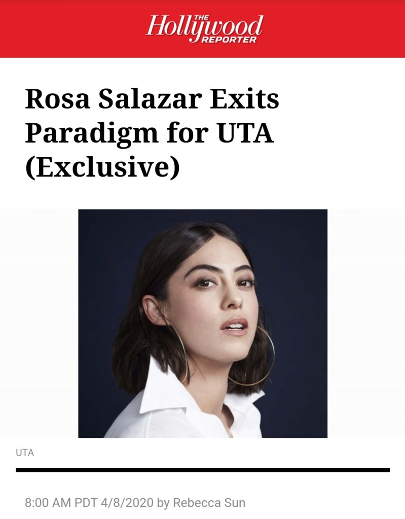 “Rosa Salazar has left Paradigm for UTA, The Hollywood Reporter has exclusively learned. A source tells THR that the move was not related to Paradigm’s recent pandemic-induced agent layoffs…