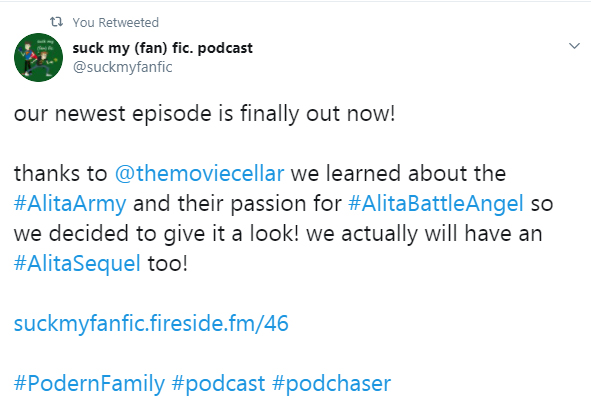 Tweet quote: “our newest episode is finally out now!thanks to The Movie Cellar we learned about the #AlitaArmy and their passion for #AlitaBattleAngel so we decided to give it a look! we actually will have an #AlitaSequel too!”