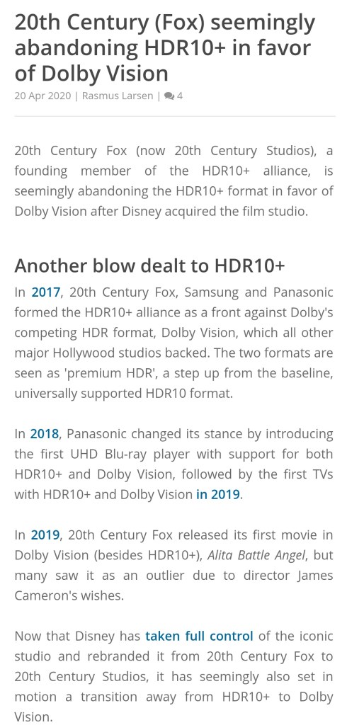 “In 2019, 20th Century Fox released its first movie in Dolby Vision (besides HDR10+), Alita Battle Angel, but many saw it as an outlier due to director James Cameron’s wishes. Now that Disney has taken full control… it has seemingly also set in motion a transition away from HDR10+ to Dolby Vision.”