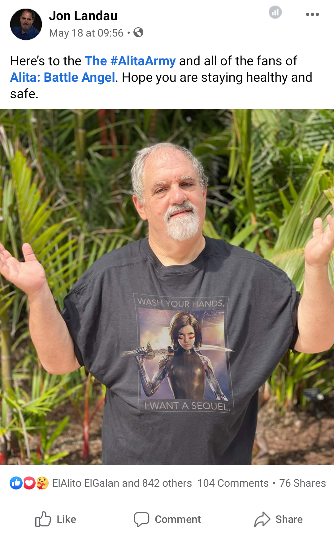 Update 4/21: We later noticed that, on Facebook, Jon Landau tagged both the official Alita movie account and “the #AlitaArmy” Facebook page in his post. Him putting a direct link to the Alita Army page is as good of an endorsement as it can get.