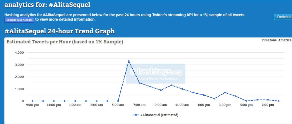 The following screenshot was taken around the middle of the day when we had almost 12,000 “#AlitaSequel” tweets in total.