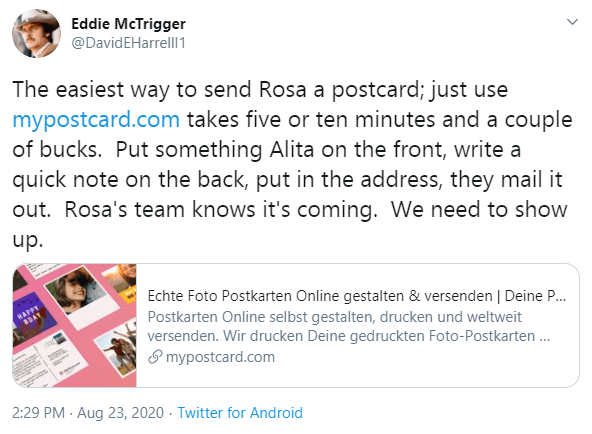 The easiest way to send Rosa a postcard; just use http://mypostcard.com takes five or ten minutes and a couple of bucks. Put something Alita on the front, write a quick note on the back, put in the address, they mail it out. Rosa’s team knows it’s coming. We need to show up.