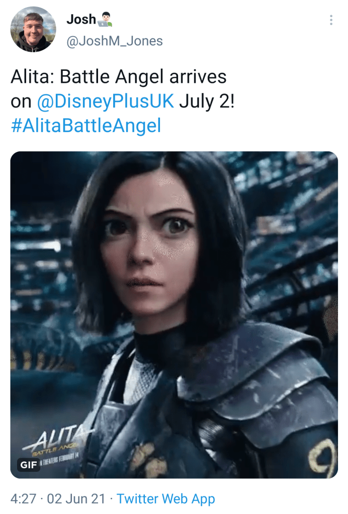 According to Joshua Martin-Jones of thestreamr.com, Alita: Battle Angel will start streaming on Disney+ Star in the UK on July 2.