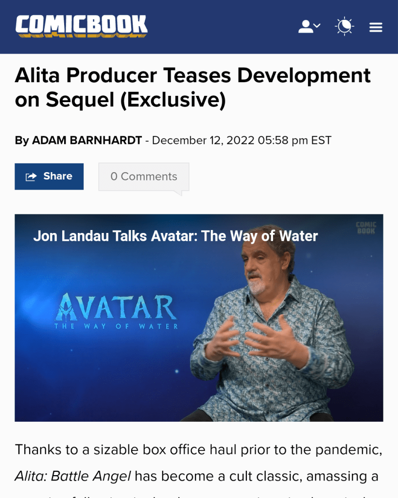 Talking with Brandon Davis of Comicbook.com, Jon Landau gave his reaction to seeing the #AlitaDay ad that the Alita Army took out in the L.A. Times.