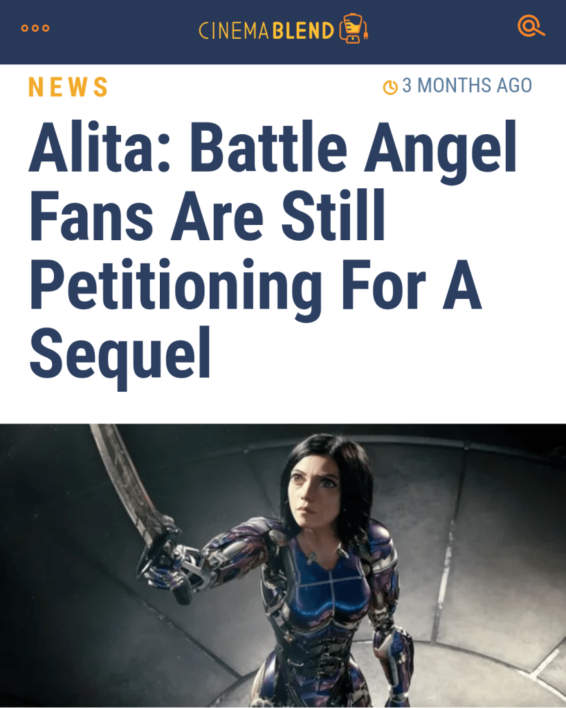 Petitions like these don’t do much as far as affecting change in a direct way, but what they can do is symbolize public interest in a particular cause. This is a way for Alita fans to demonstrate that they want to see Alita 2, with the idea being that the people and corporate entities with the power to greenlight the sequel see this petition and get the message that another movie is a viable proposition.”