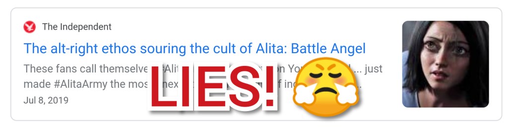 So far, the Independent denies my request to them that they retract their smear piece and clear our name of any alt-right affiliation. I would like for this horrible stain on the #AlitaArmy community to be wiped away. Thank you.