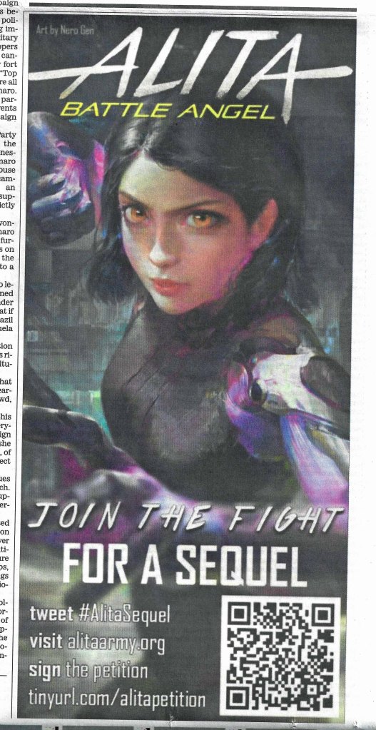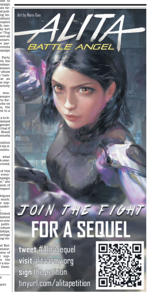 The reason that the LA Times was chosen for our ad was that we believe there’s a very good chance that it will be seen by Disney executives. The hope is that they will be impressed by Alita’s fanbase and greenlight an Alita: Battle Angel sequel. The ad will also point readers of the LA Times to the sequel petition and will result in more people signing it. Fans of Alita: Battle Angel will also learn about the campaign for a sequel and join us, adding to the pressure on Disney to greenlight an Alita sequel.